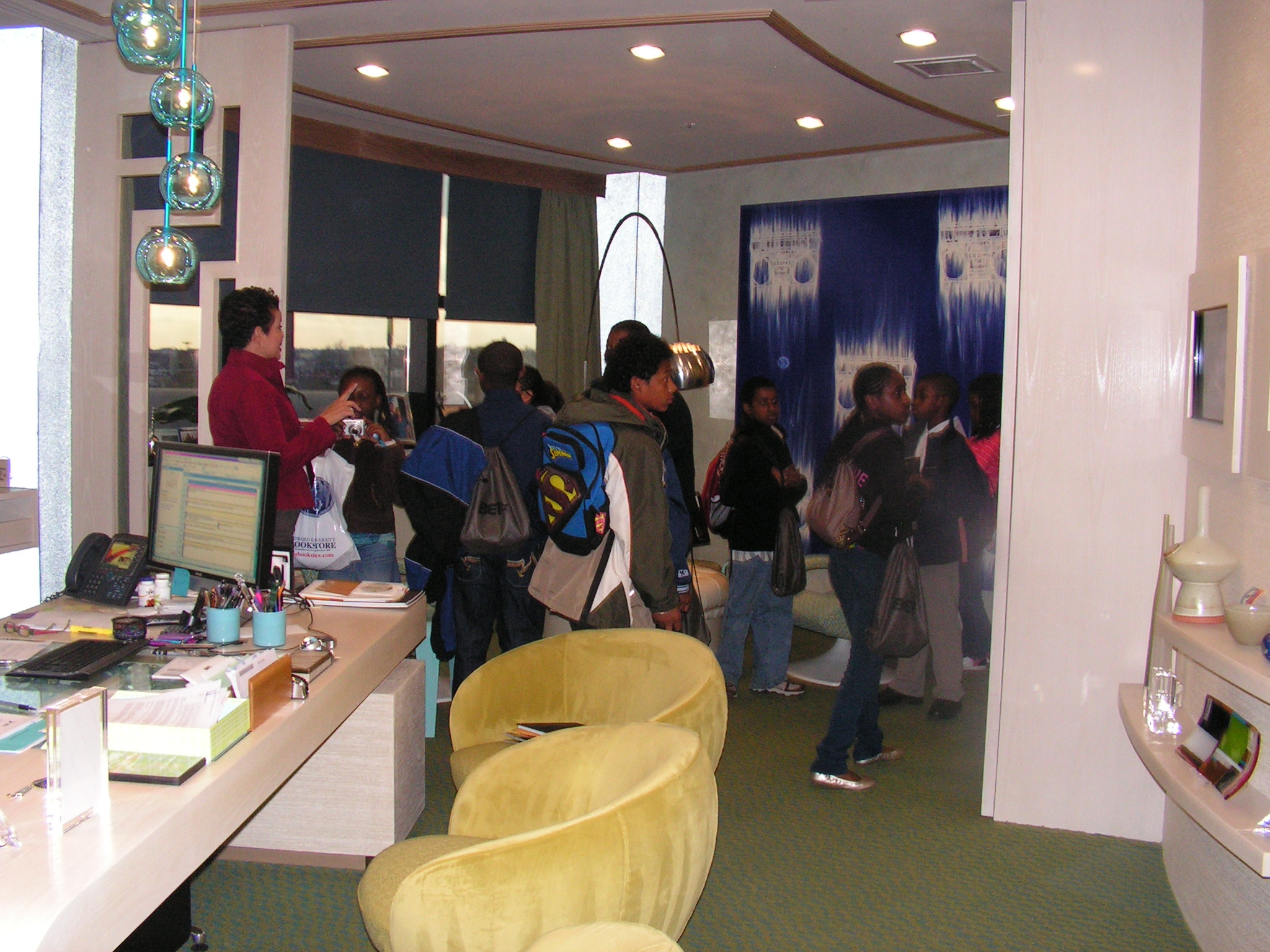 When we arrived at the headquarters, we ate lunch with Antoinette Woodland, an interior designer. After that we talked and asked her questions. When we were done we met one of the producers, Andre Joyner. I really enjoyed his sneak peek animation. He produced scenes for the BET Awards program and other commercials for BET. He was so nice and cool and he really loved his job. After that we met a man named Jason Skinner. He was an overnight supervisor. He showed us around the studio and we got to see how the different shows started on different times since it was going all around the world. Following that, we took pictures and went to eat dessert with Antoinette Woodland while watching the BET Awards When we were done and about to leave, we saw Debra Lee, BET's CEO. She was very nice and pretty. We took pictures with her and we got to go in her office. Her office was so nice and attractive. If you saw her office you wouldn’t be able to imagine just how big her house was. There were nice chairs and tables and she also had a bathroom! In the bathroom she had a makeup area and had stalls. Overall all the people we met at BET Headquarters all loved their jobs and got along very well. Some of the people I met were Antoinette Woodland, interior designer; Carey Manhertz, VP of Operations; Andre Joyner, video editor; Jason Skinner, overnight supervisor; Scott Mills, COO; and Debra Lee, CEO. I really enjoyed them and I hope to see them again. |
